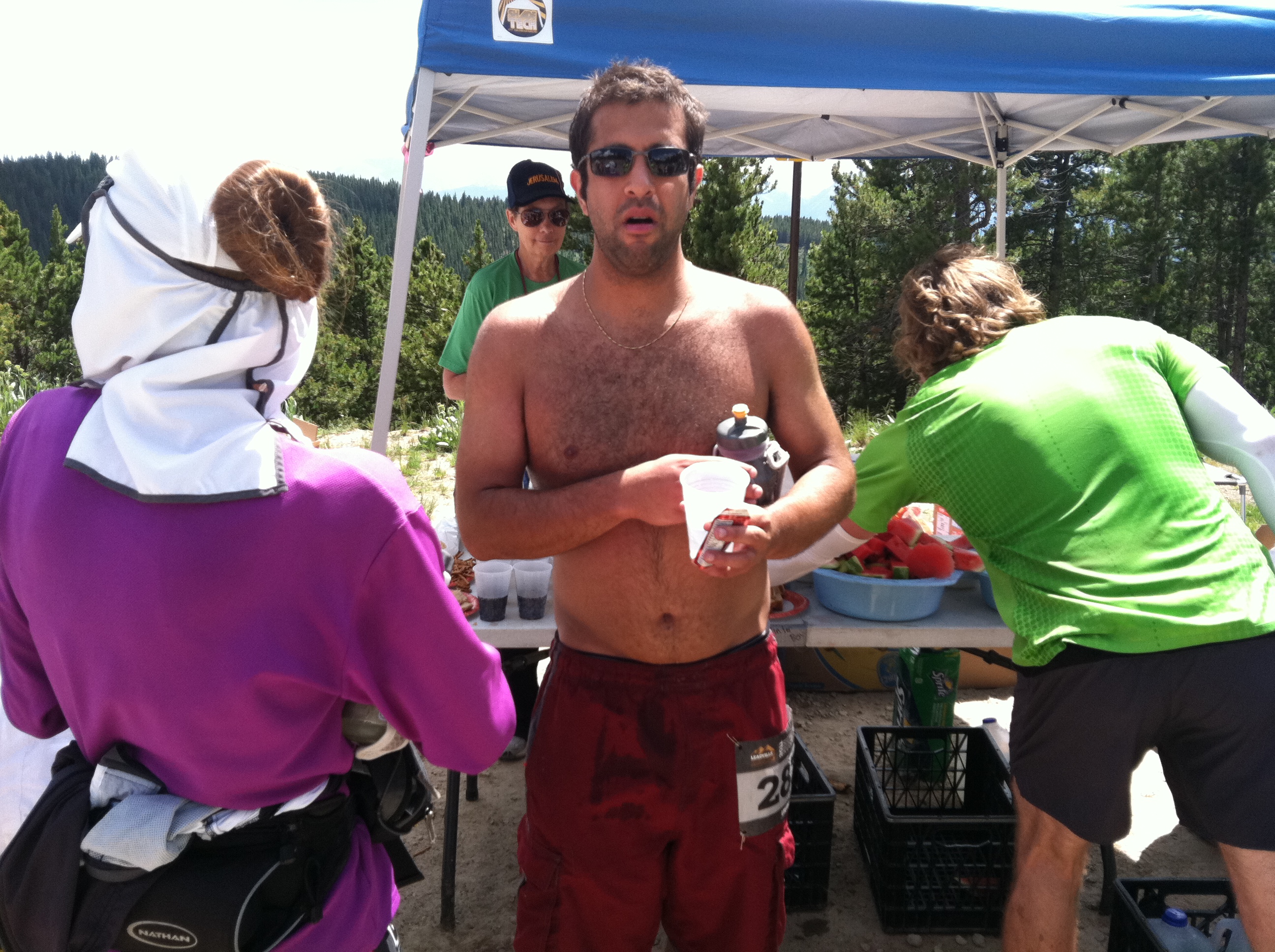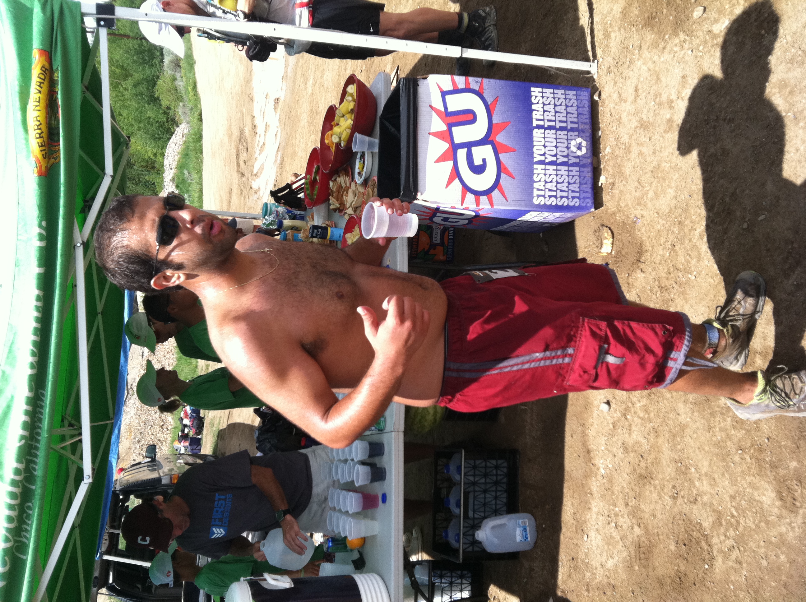 The next few sections of the race proved rather difficult. Not only I had doubts, but I came across some intense steep sections and I was feeling completely depleted of energy. With about a mile left before the turn around point, another racer ran past me and asked if I knew of a cut off time for the half way point. Not knowing, all I said was that I have no idea. I move myself into another jog after that leaving her behind a little bit and back to a walk. I was graced with her presence once again as she caught up to me telling me that if we keep at the pace we’re at, we should make the half way station by six hours giving us an eight hour cushion to make the fourteen hour cut off time of the entire race. Again, not being up for small talk, I didn’t give much of a response and didn’t want to let her know I had no intentions of finishing the race. She then noticed I was covered in salt, and offered me salt pills which I gratefully accepted. She also told me her husband will be at the aid station and should have a large supply of the pills to provide to me since I tend to lose salt easily. After her kindness, I started opening up a little more and making more small talk where I also learned of her name, Anita.